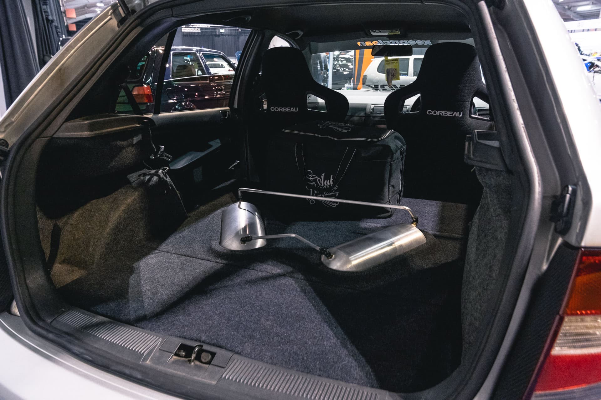 Two seamless tanks sit where the rear seats would ordinarily be, sunk into the fabricated floor that matches the OEM grey carpet.